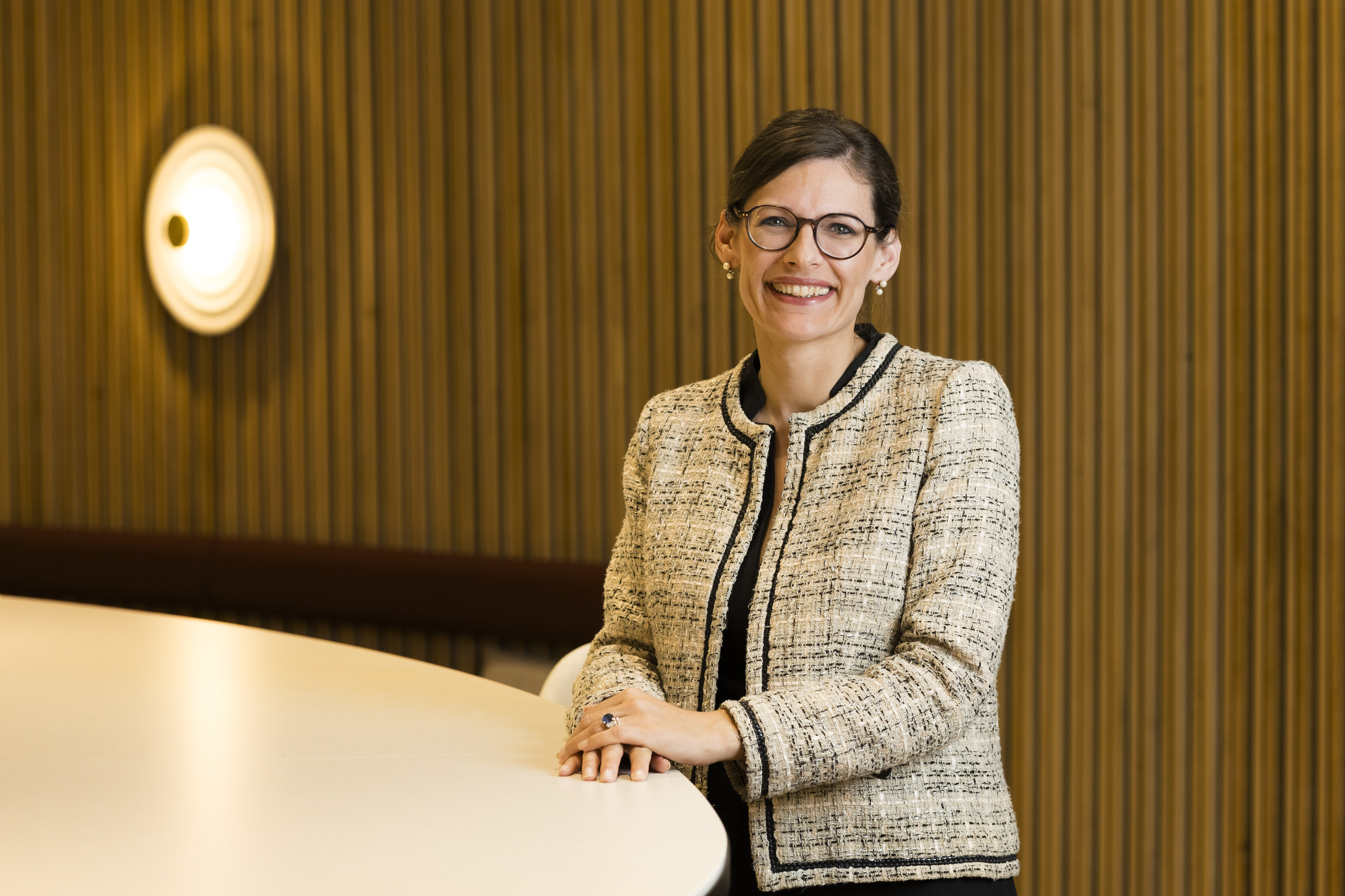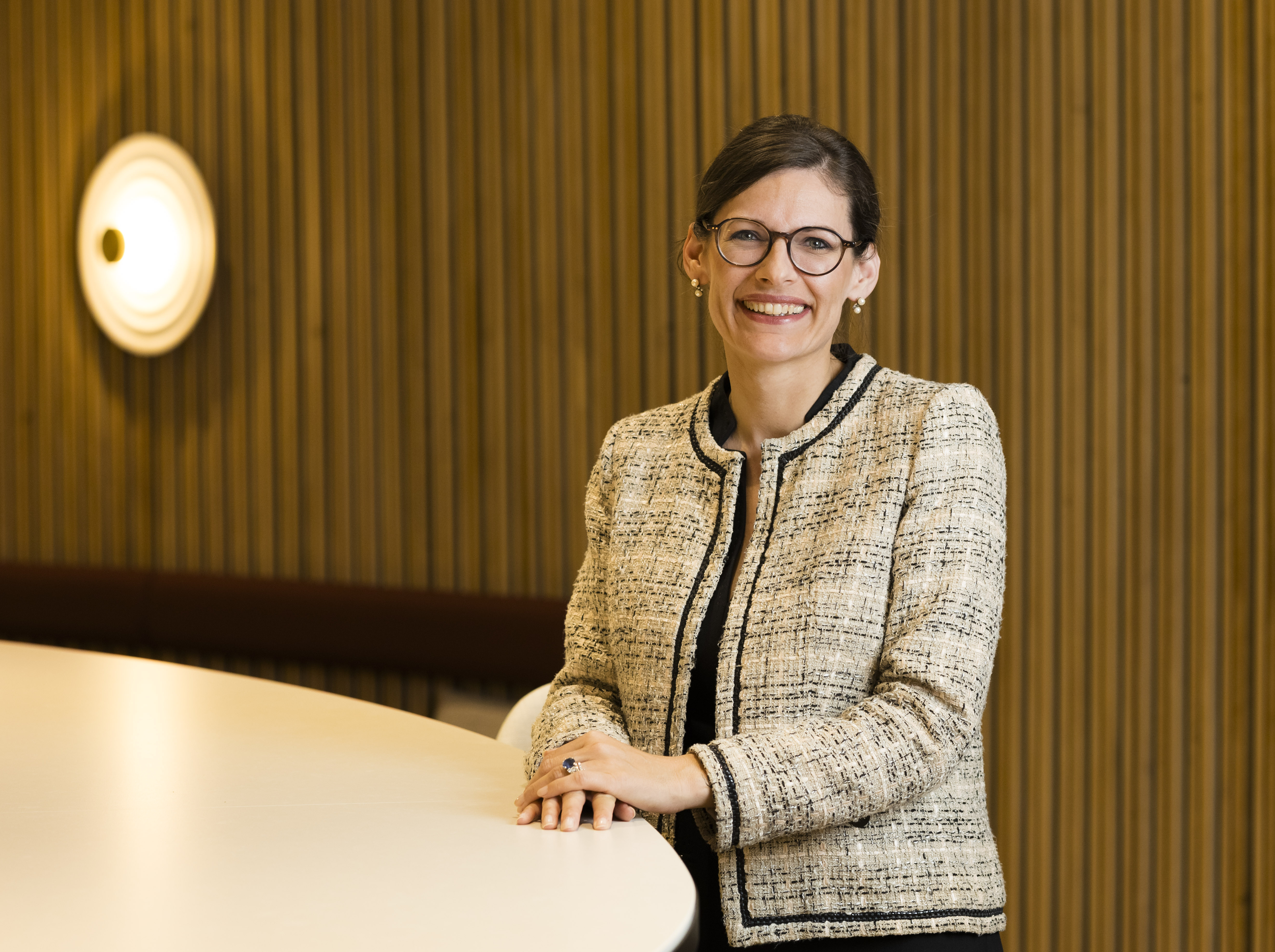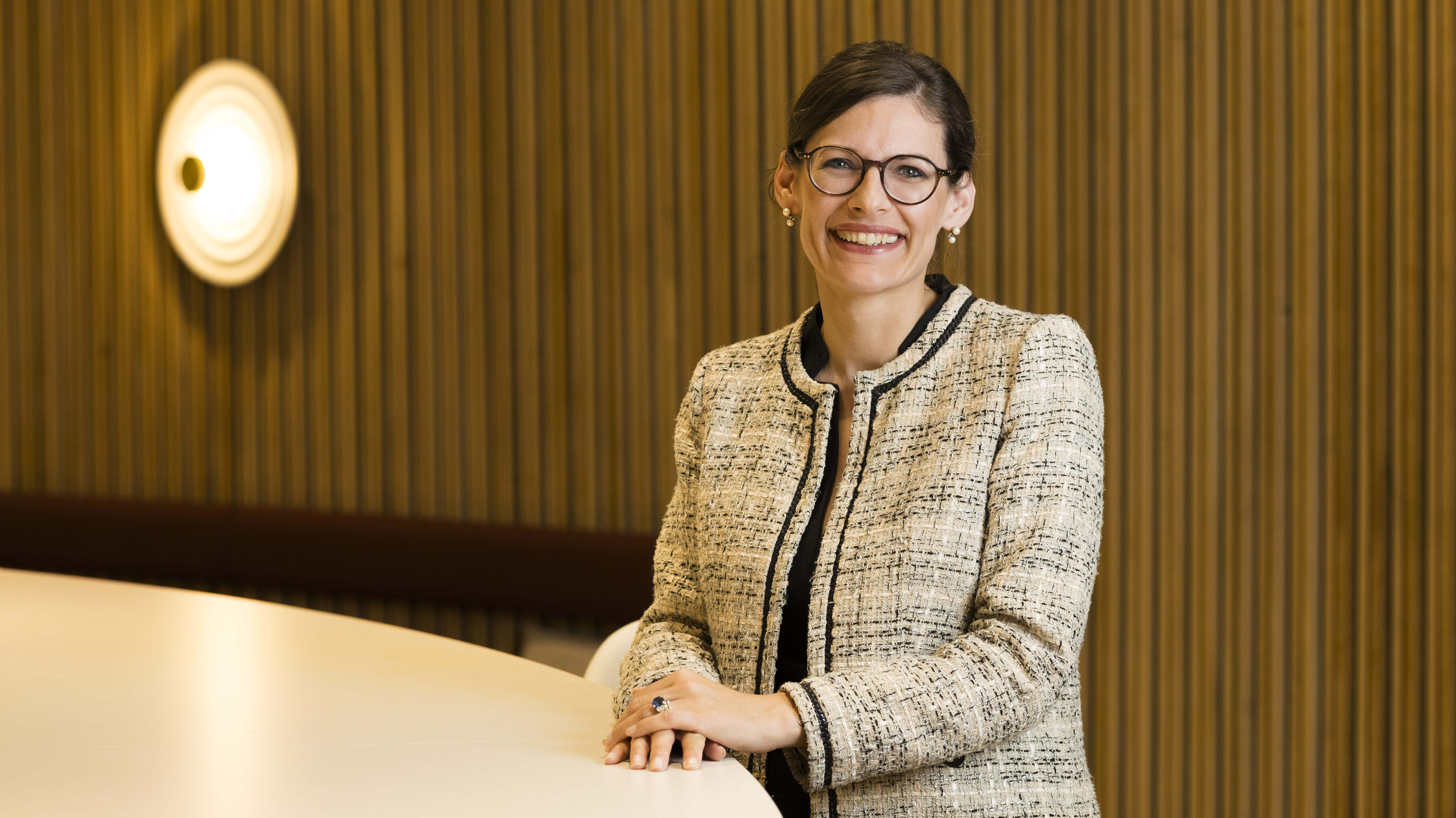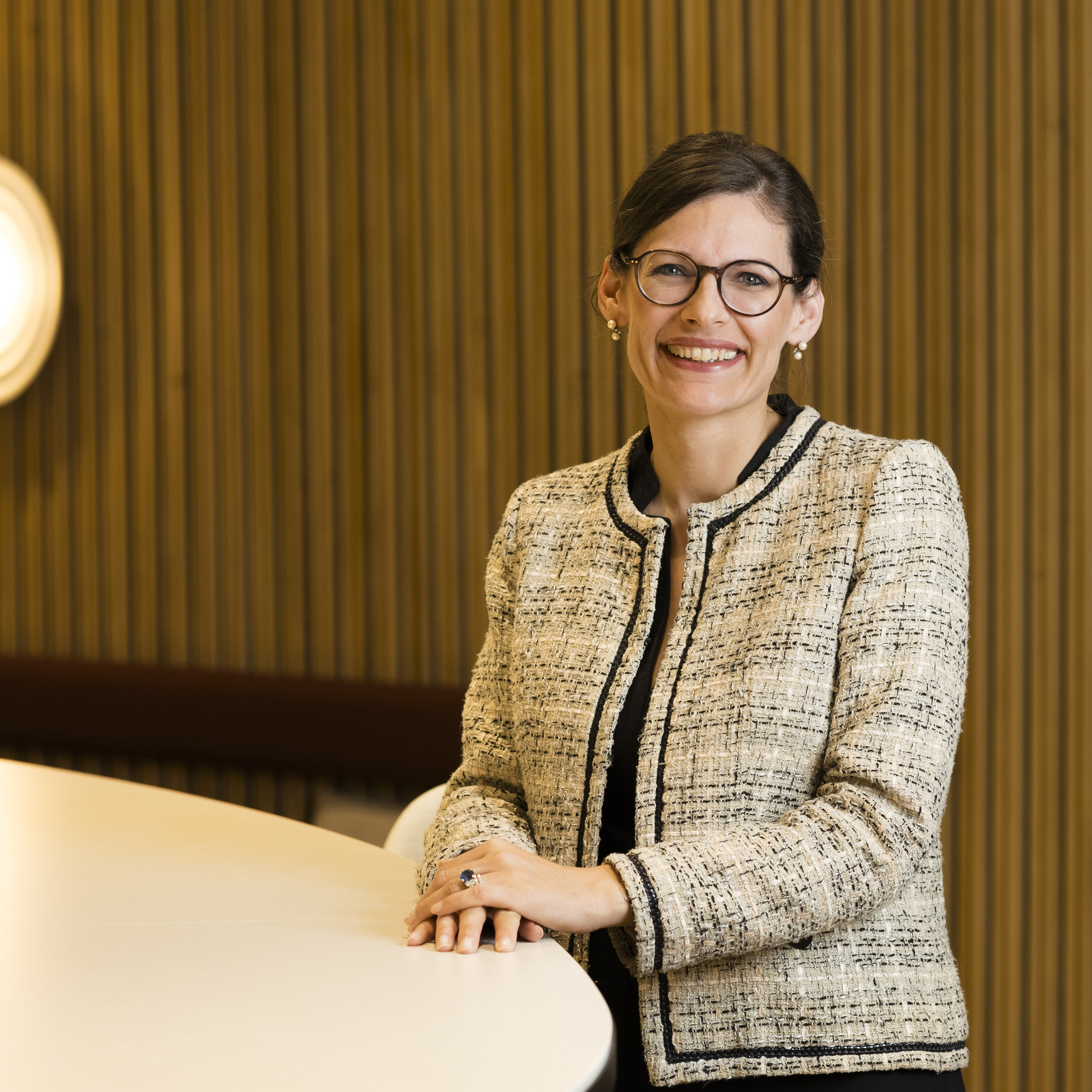 Femme aux cheveux bruns et lunettes devant un mur en bois clair, s'appuyant sur une table avec veste en tweed beige à motifs.