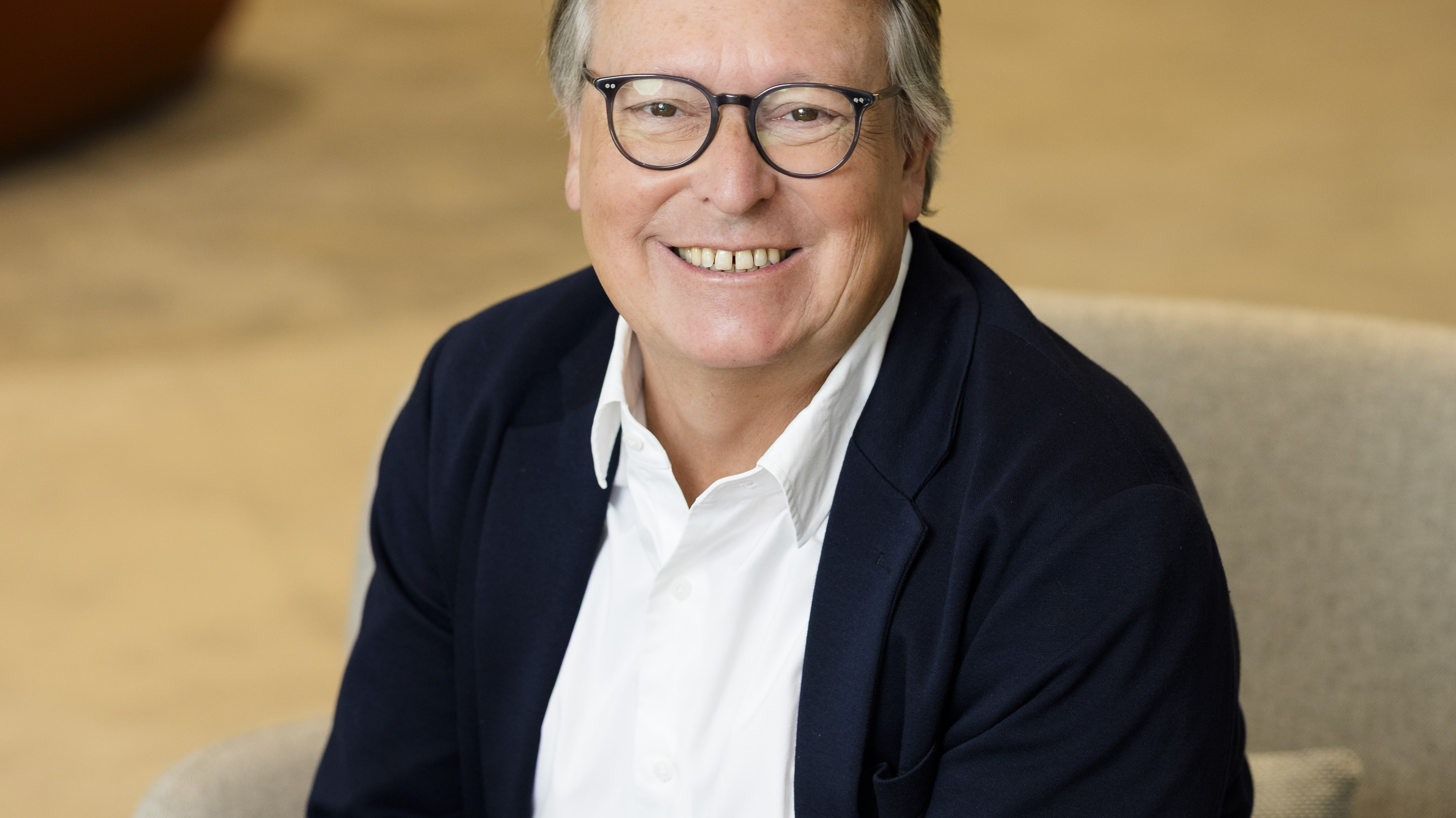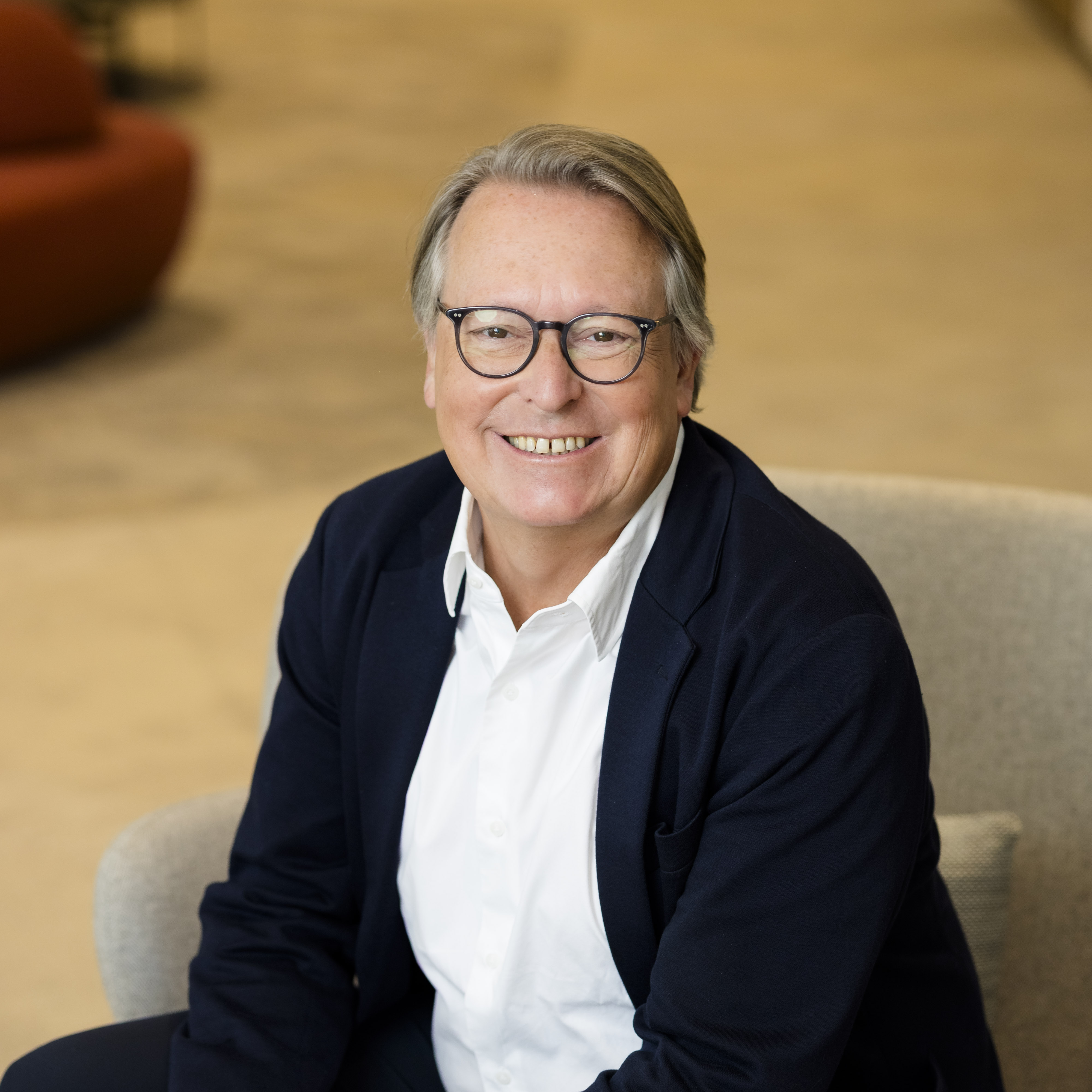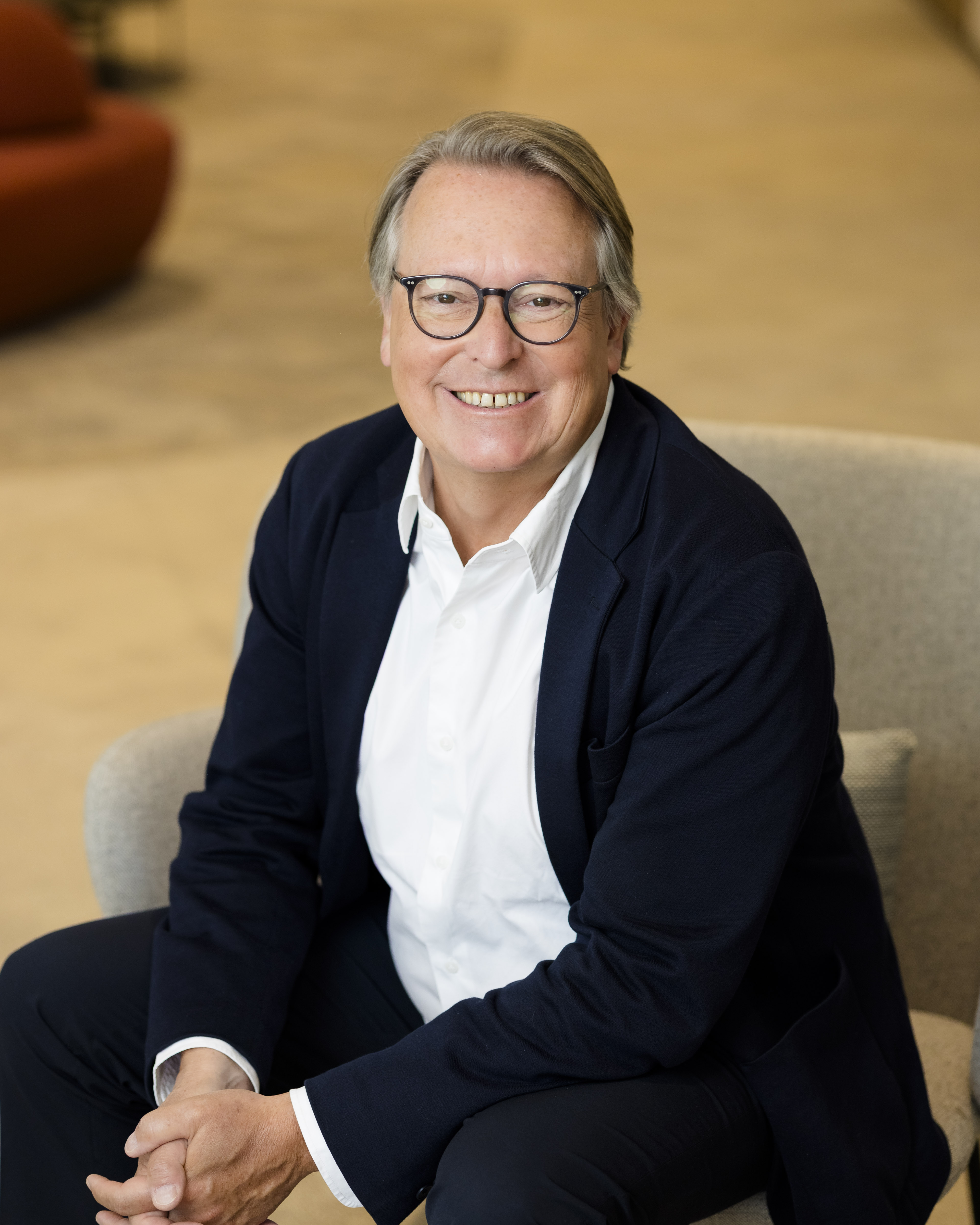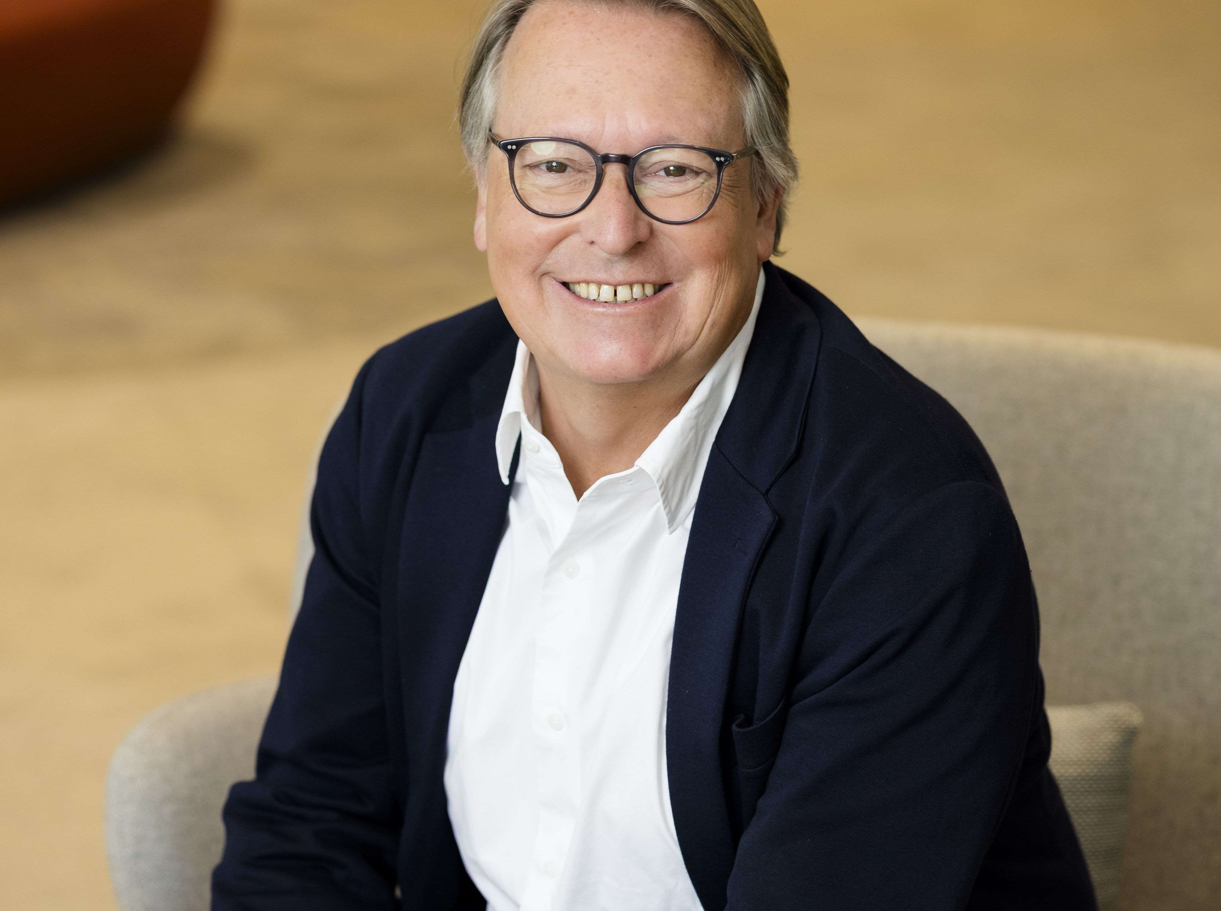 Portrait d'un homme aux cheveux gris portant des lunettes, assis dans un fauteuil dans un espace moderne avec fauteuils orange.